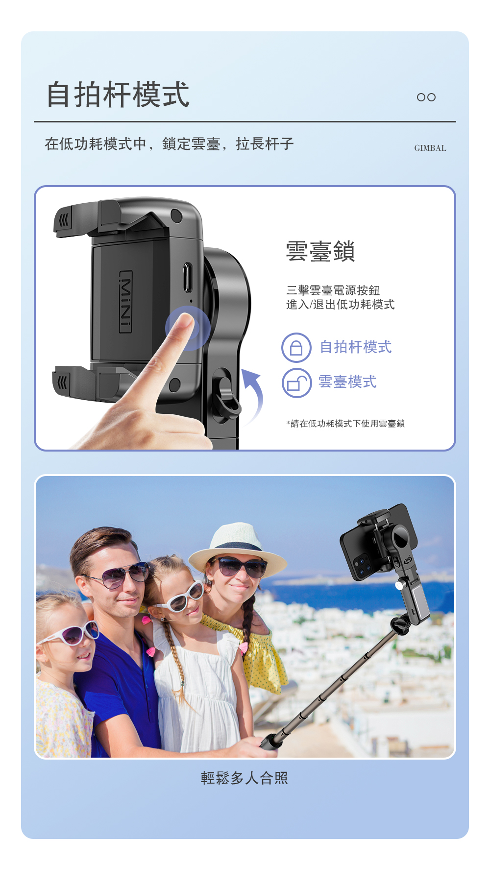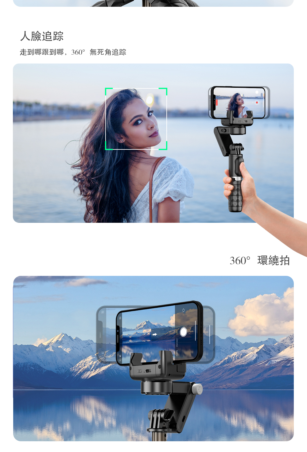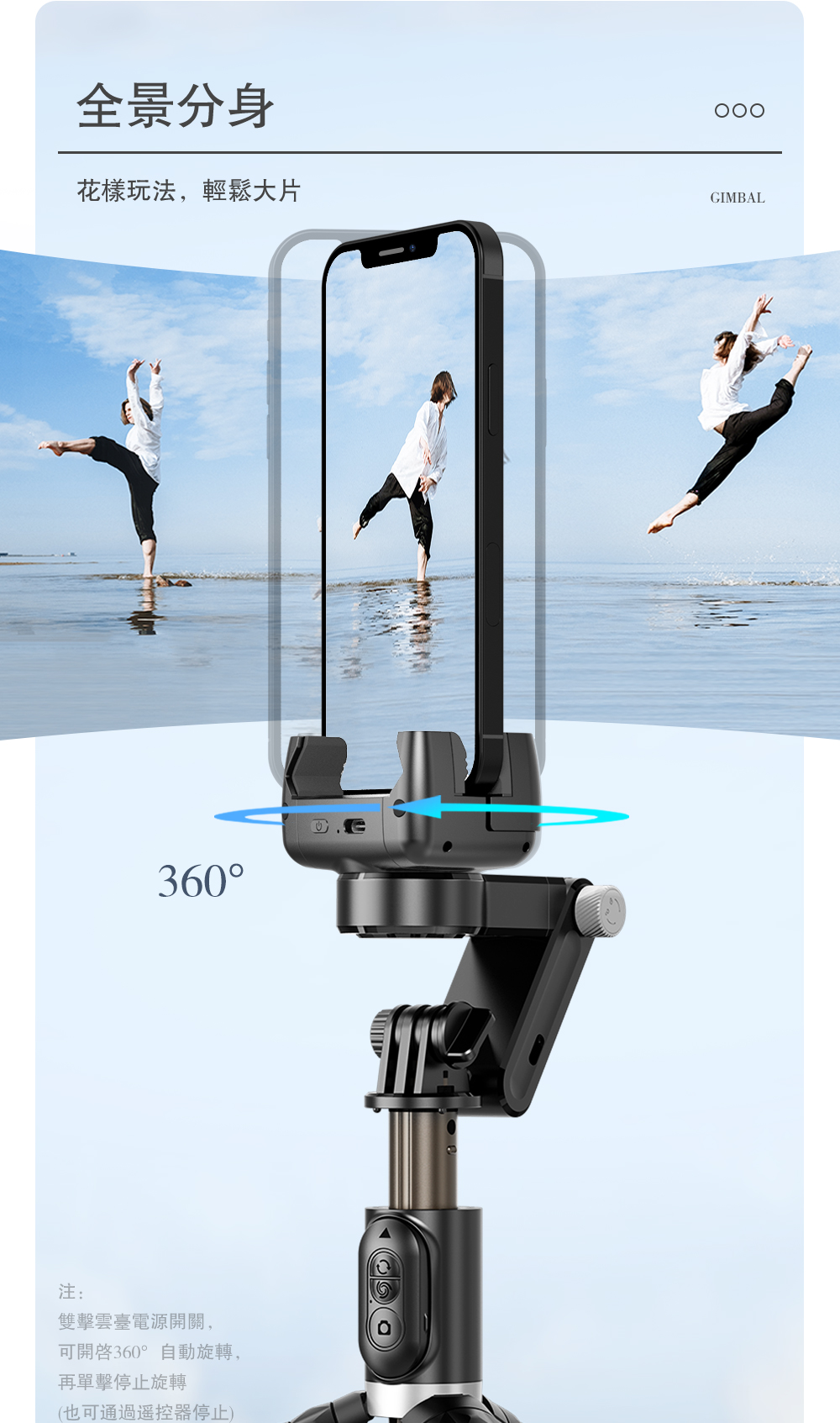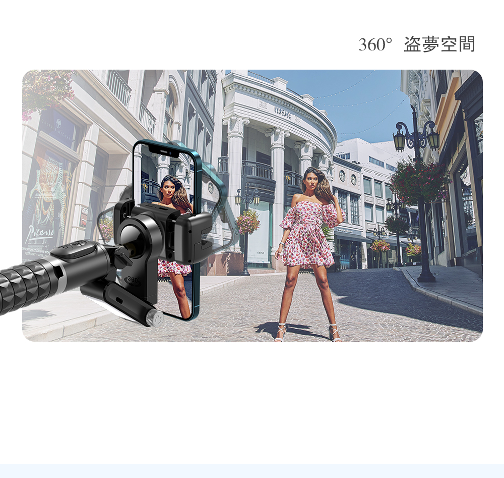 功能:三腳架、單軸防抖、盜夢空間、半跟隨、遙控旋轉、折疊夾頭、人臉跟隨(僅限APP內)
