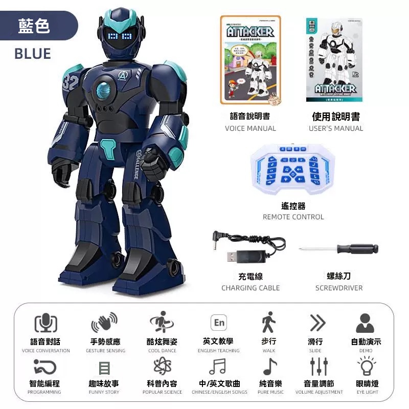 ★產品配置:機器人1只、遙控器1個、3.7V 3.5彎頭USB充電線1條、說明書1本、語音控制提示卡1套、螺絲刀1把