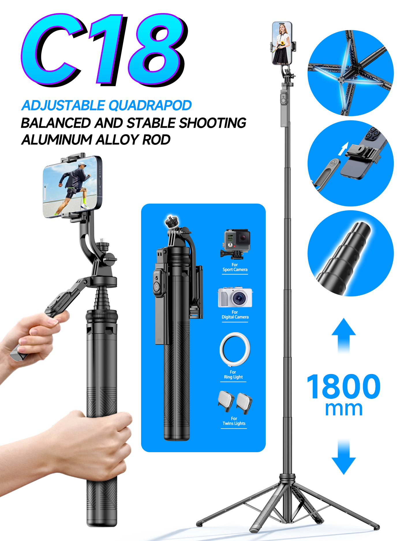 功能:內三角四腳架、旋轉鎖扣、雙手柄、1/4螺絲頭、360旋轉雲台、可拆卸夾頭